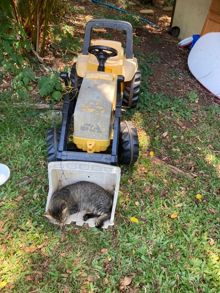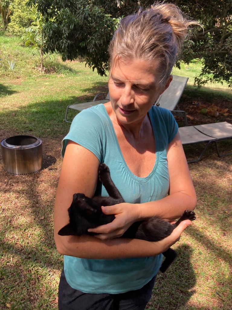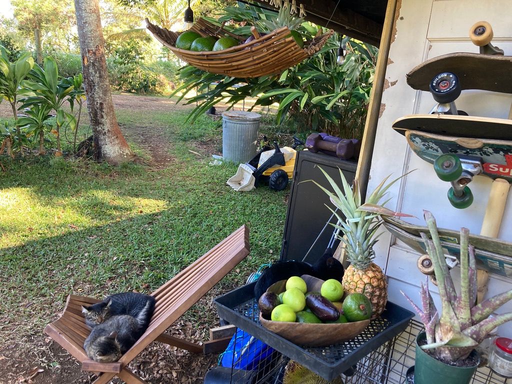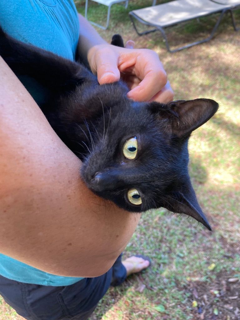 The night before we got to Hawaii, Rebecca dreamed of a black cat face and guess who the tiniest cat was at the farm? A black cat named "Batman". Probably the most roudy and he loved the counters in the kitchen. Once Skye got the BB gun to be a threat, (all he'd have to do is just shake it) and they didn't come in the kitchen (until after we left the house). Cockroaches and geckos also roamed free and liked the countertops too!