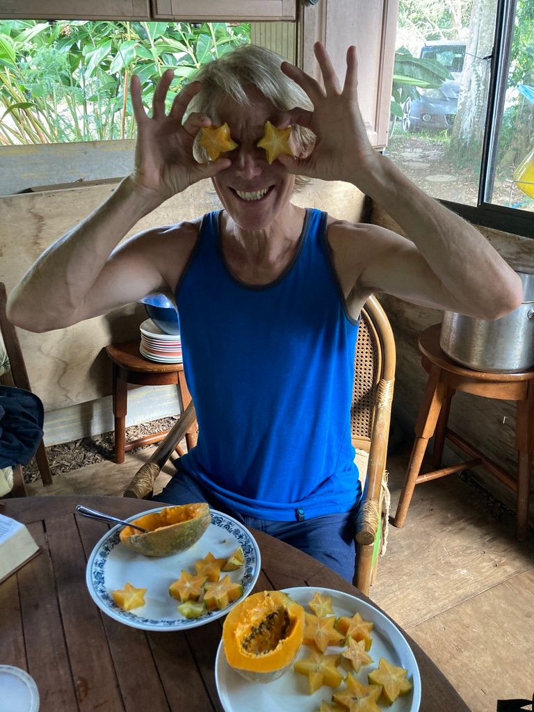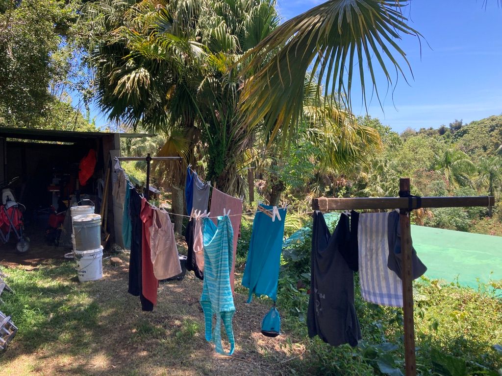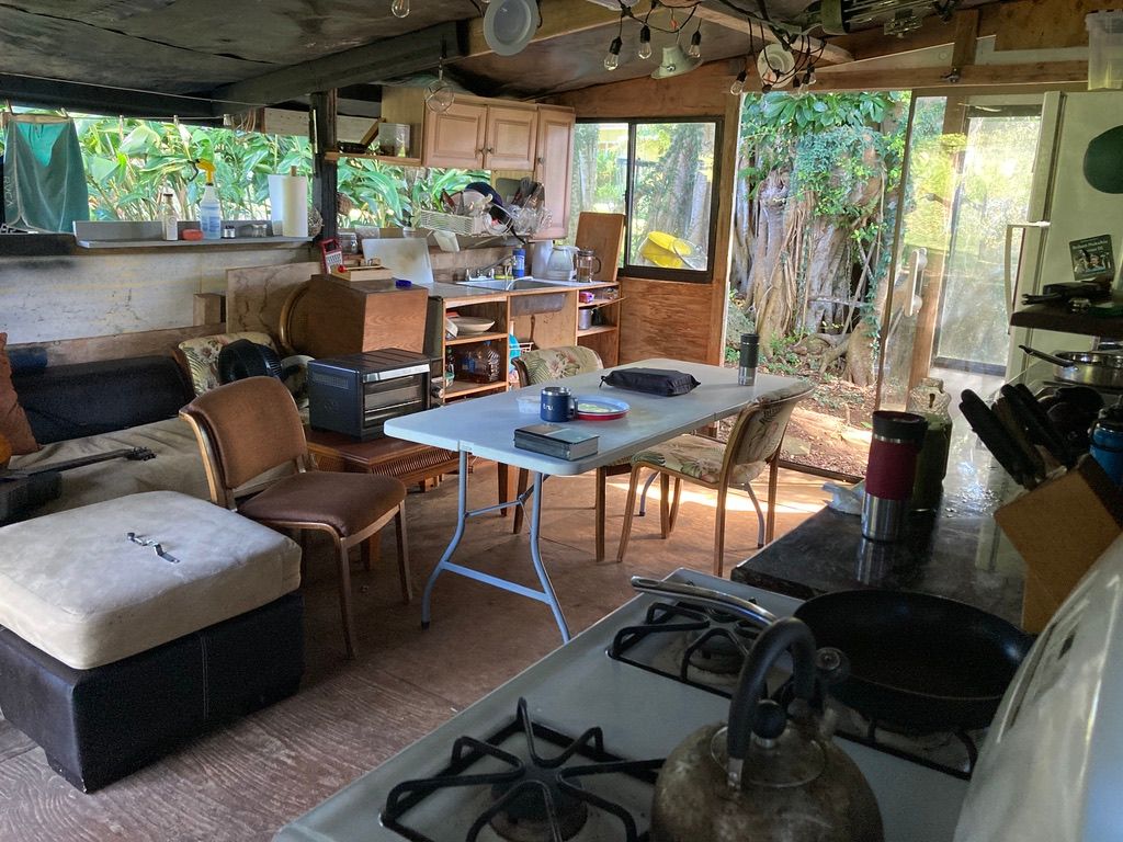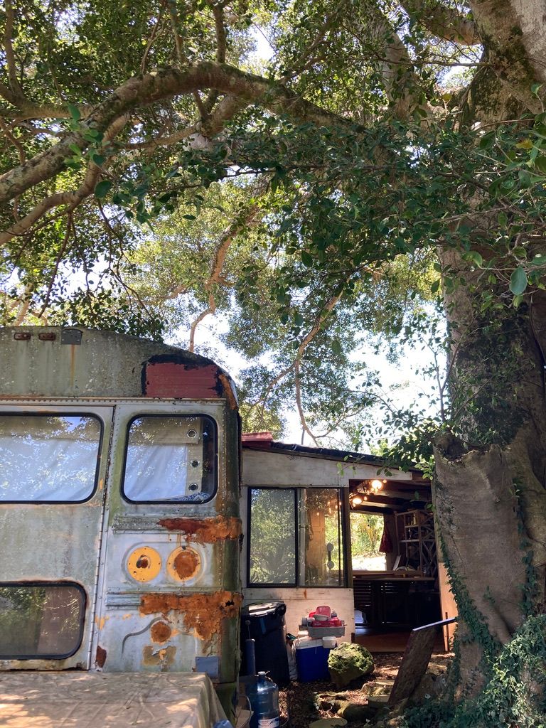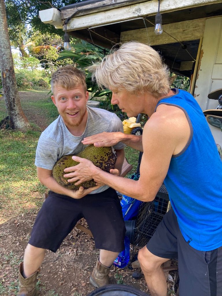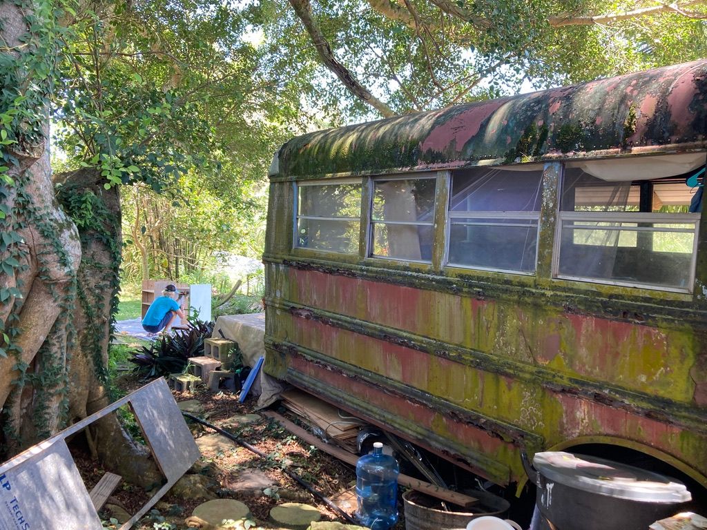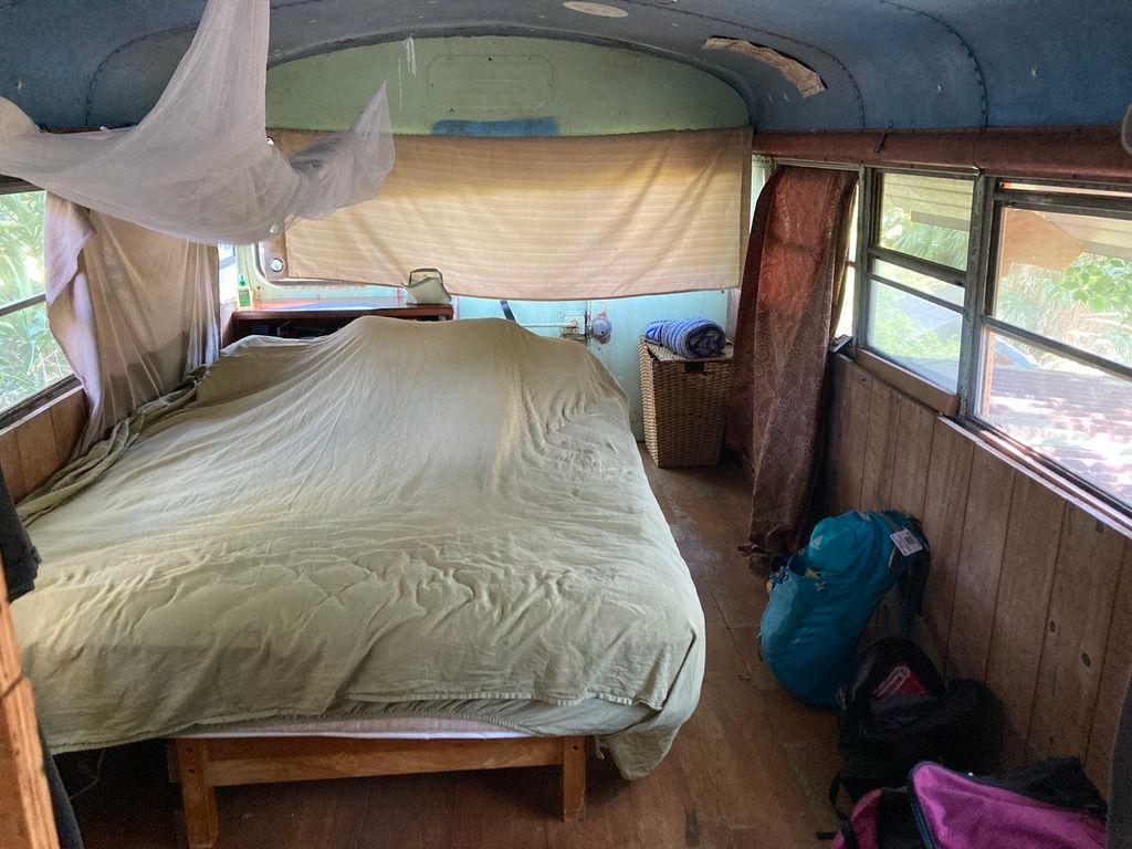 Our 25 year old brother in Christ, Timothy, and his dad, Gregg, welcomed us to their homestead farm property on the far reaches of the more remote part of the island. Timothy gave us his old school bus to stay in which was his home. He went down to the “monkey camp”, the homespun structure below on the property where the young men staying on the property would stay. The bus has a kitchen built onto it, all from free materials, that Timothy built as a community kitchen and hangout area for the people staying on the property.